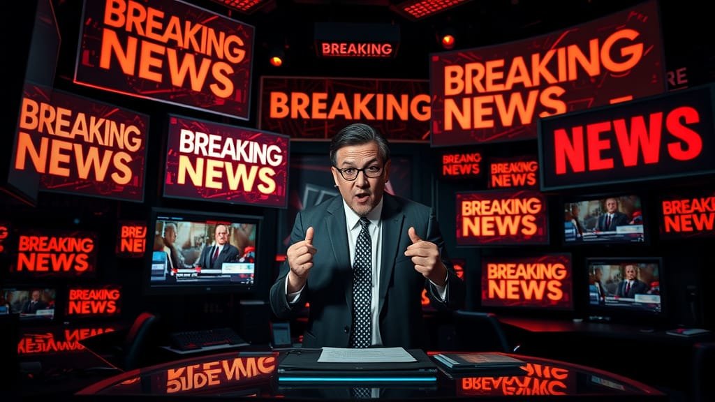 Something closer to theatre performed with a microphone and a red “BREAKING” banner.