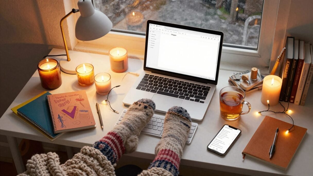 Because what actually happens is you spend three hours arranging the candles, take forty-seven photos trying to get the “casual creative workspace” shot just right, realise you’ve forgotten to actually light any of them because you were too busy curating the aesthetic of productivity, and then you give up and watch true crime documentaries until your eyes hurt.